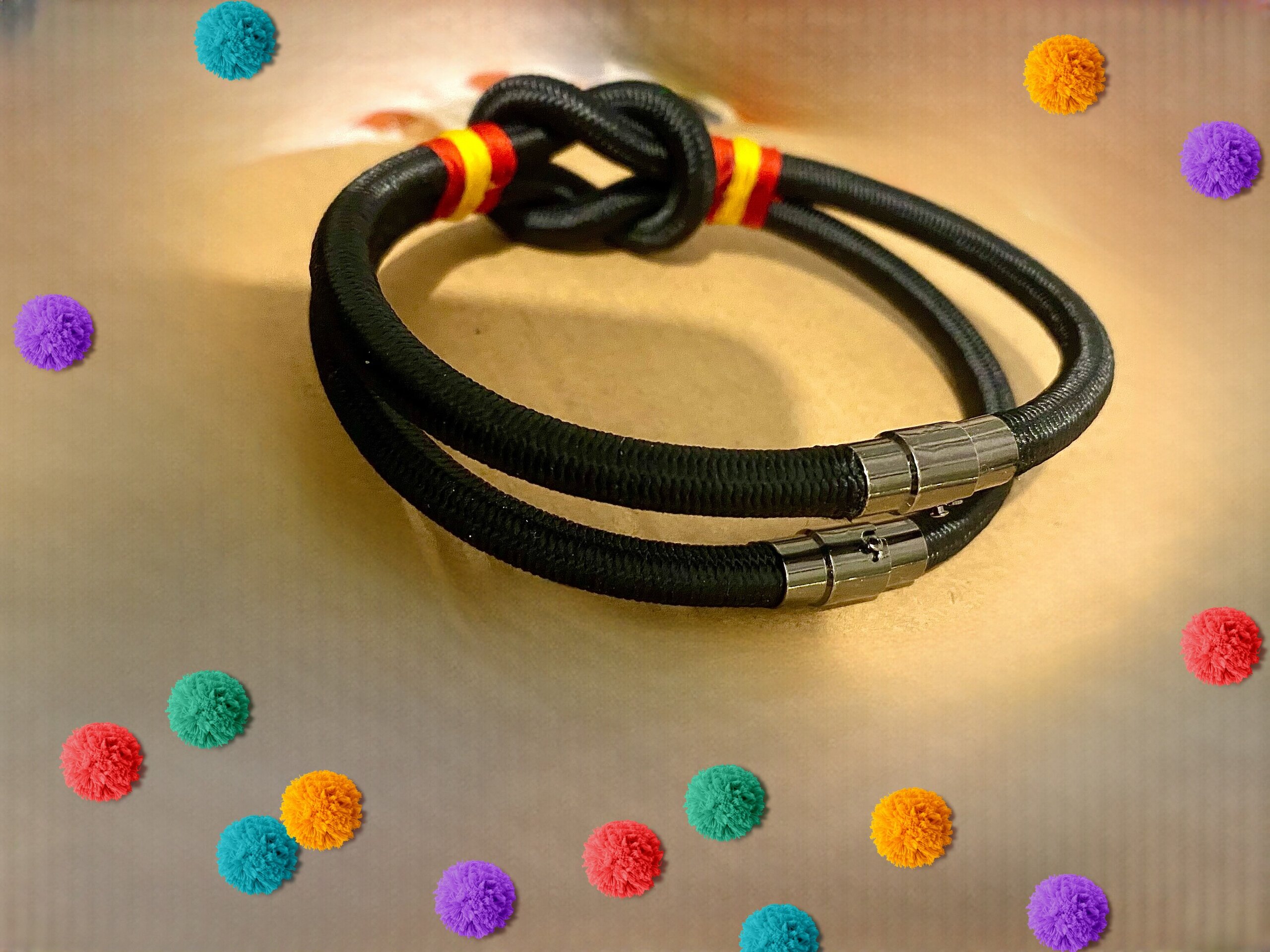 Descubre nuestra pulsera negra de cordón de poliéster trenzado con alma decorada con hilos en los colores de la bandera de España.